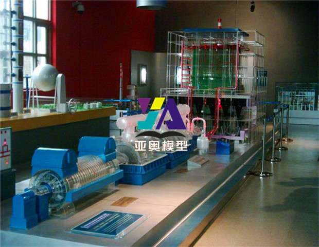 3),1000MW发电机及其主变系统:发电机为上海汽轮发电机有限公司生产的THDF125/67型三相同步汽轮发电机,采用水-氢-氢冷却方式,定子绕组为直接水内冷,定子铁芯及转子绕组为氢气冷却,密封油系统采用单流环式密封结构;发电机模型外形包括:发电机,定子,转子,线圈绕组,风扇,励磁机,变压器,变压器与发电机封闭母线连接;模型按比例缩小设计加工,剖视结构,电动演示,母线管道采用LED灯光流动演示;